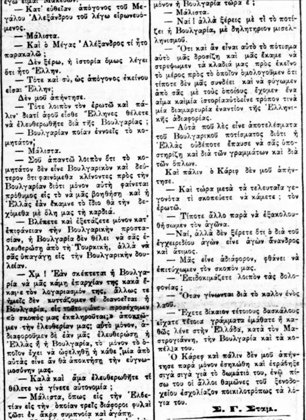 — „Тогаш“, го прашувам пак, „зошто кога веќе сте Грк сакате да се ослободите преку Бугарија?“